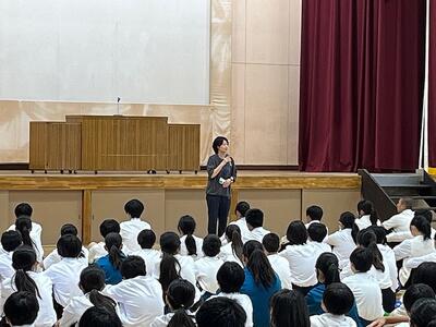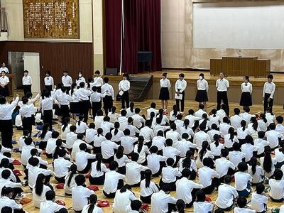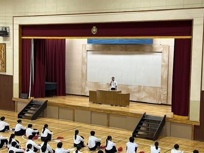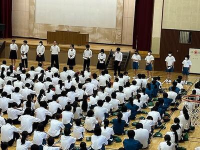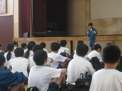 今週末に体育祭を控え、体育祭実行委員長からの言葉と、各学級ごとに実行委員から抱負が語られました。最後は、今週から学んでいる教育実習生から自己紹介がありました。将来の学校の先生の卵です。