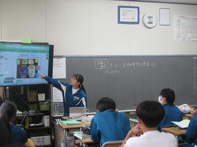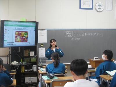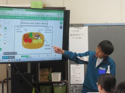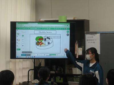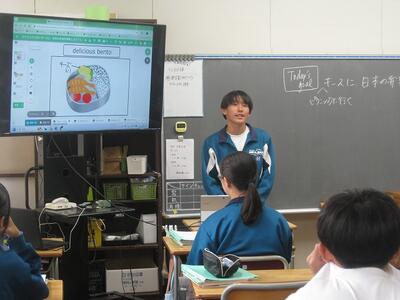 3年生の英語の授業を覗きました。「ピクニックに行くAETの先生に日本の弁当を提案しよう」の課題に沿った発表がありました。「I'm sure you like my colorful bento!」(私の色どり豊かな弁当、絶対気に入るよ!)といった表現もありました。英文の正しさも大切ですが、思いを伝えようという相手意識や工夫といったことが何より重要です。また、梅雨時を迎えたこの時期、どんなメニューが適しているのだろう。家庭科での学びや、お家の方に作ってもらう弁当を思い出してみると、愛情の深さや、別の学びが得られるかもしれません。