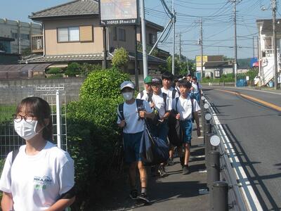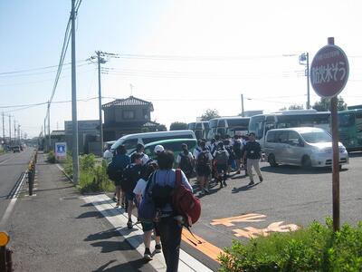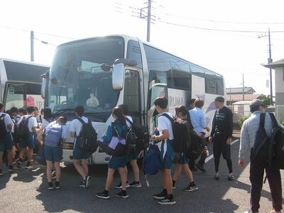 学校の体育館で出発集会を行い、ローソン駐車場からバスに乗り込み、予定通り出発です。天気にも恵まれ、充実した校外学習になりそうな予感です。