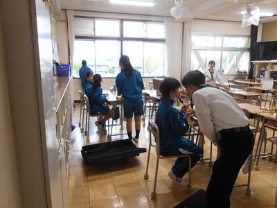 吹奏楽部は、実際に楽器を吹かせてあげ、